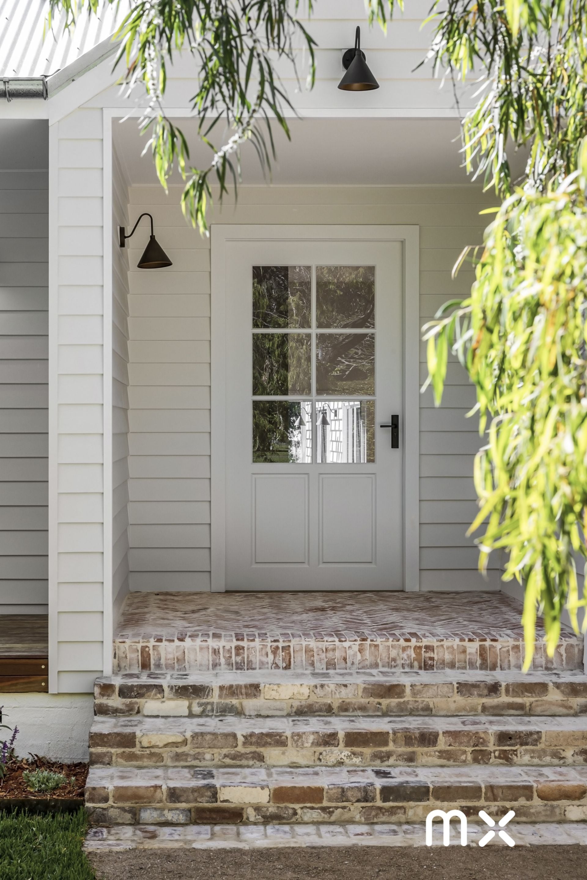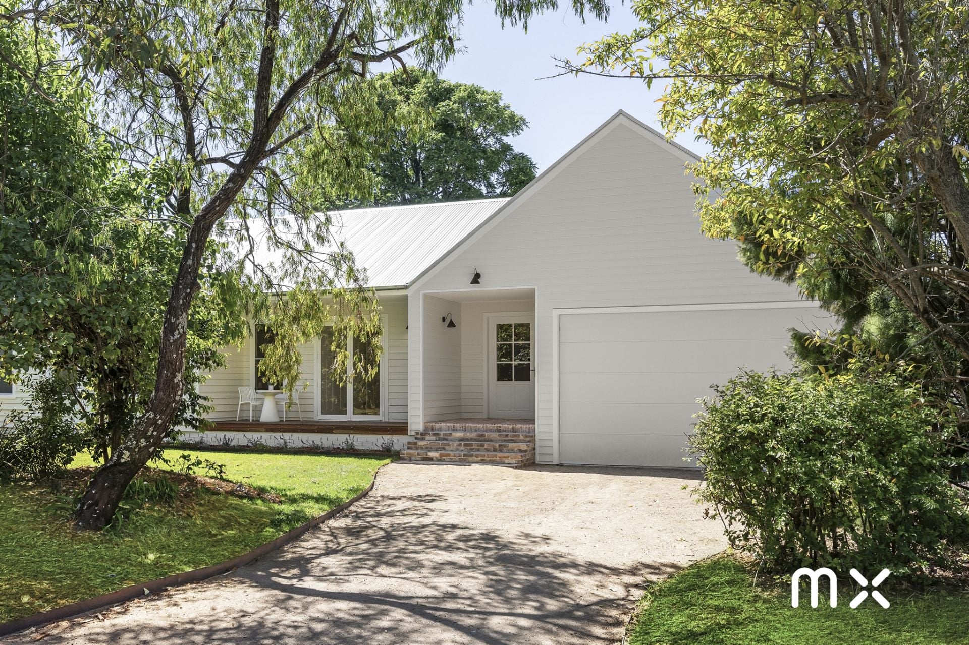 > surrounded by lush and established gardens and fruit trees for privacy, complimented with recycled brick front stairs and crush granite driveway
