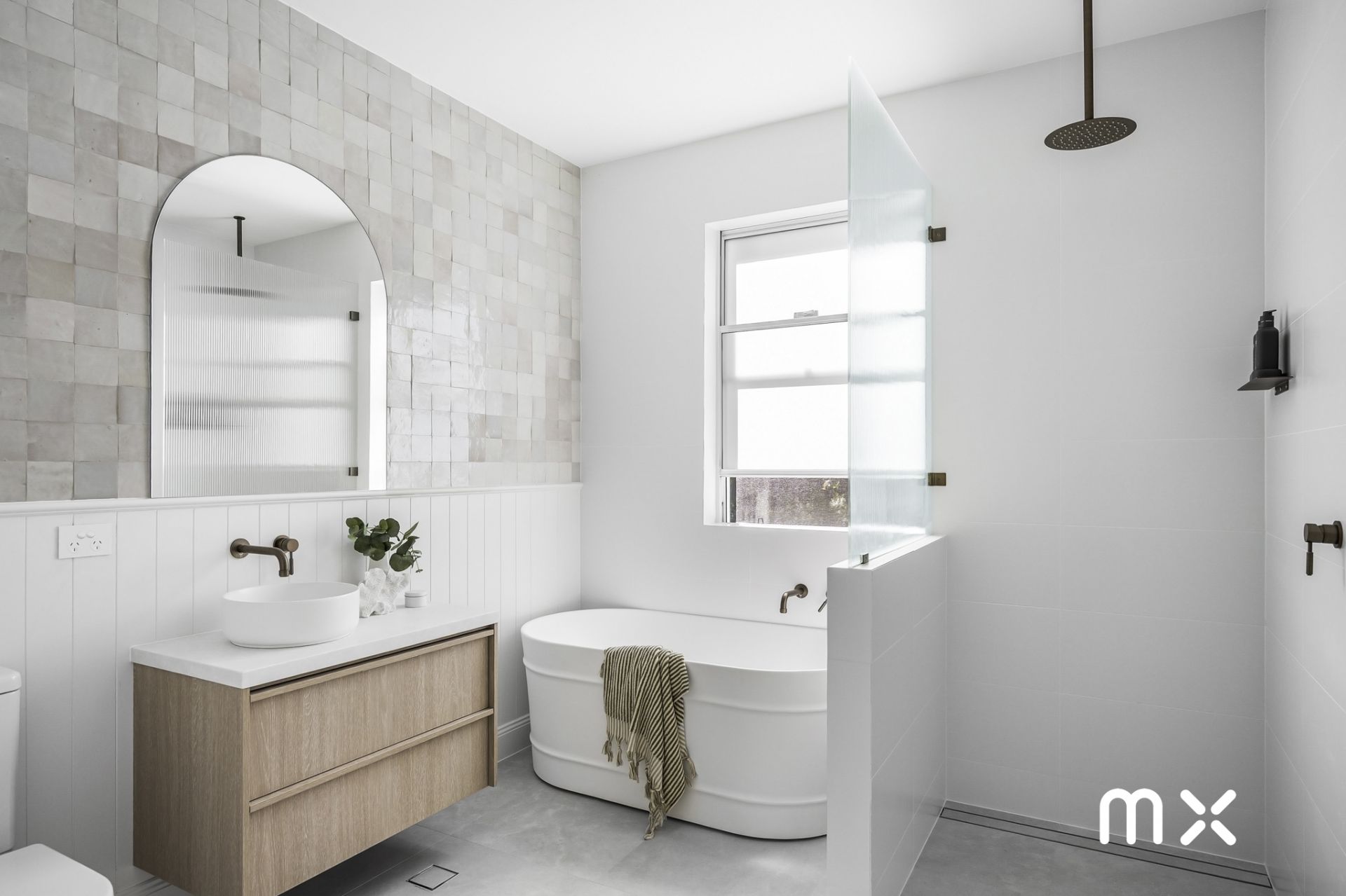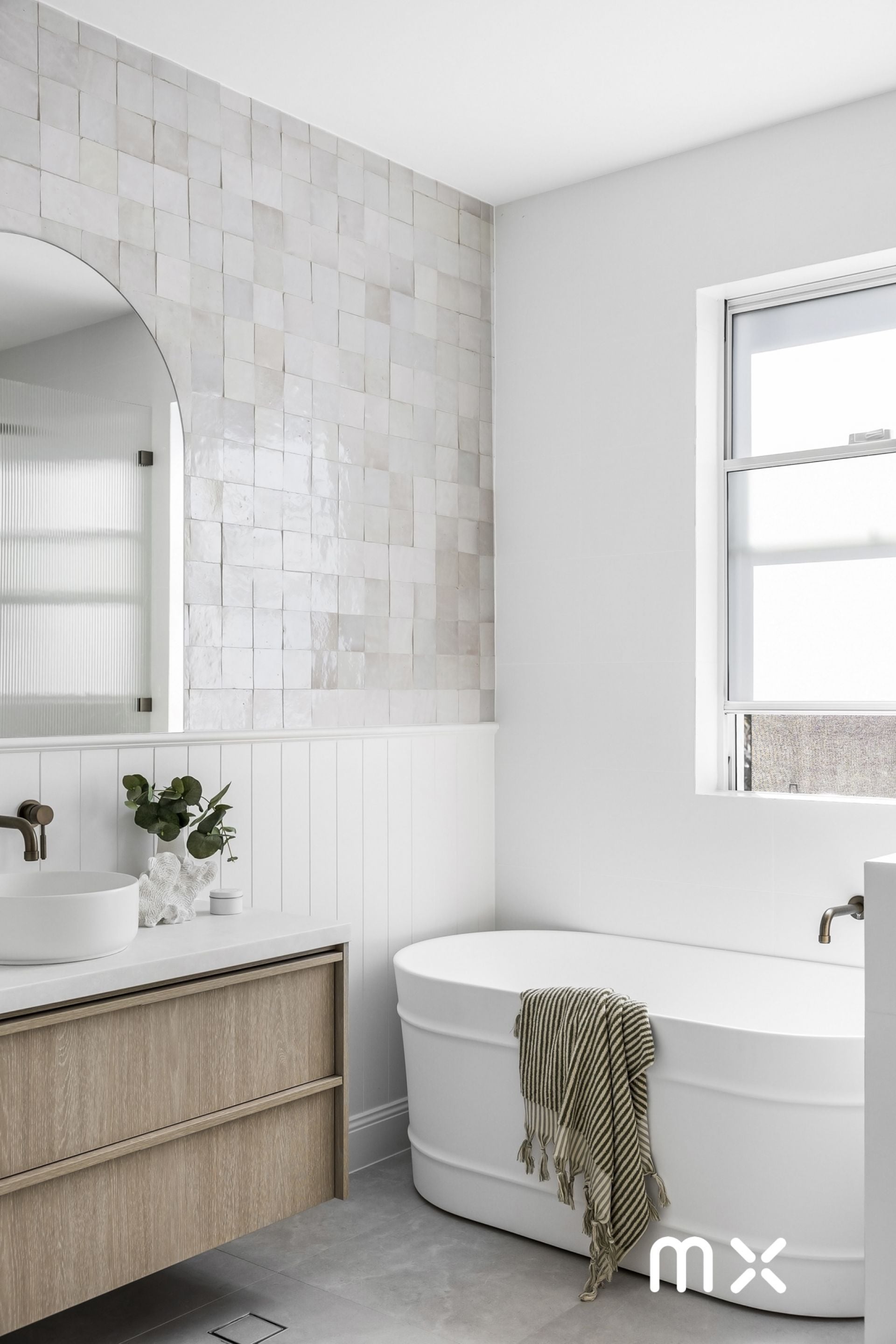 > main bathroom with Zellige morrocan hand cut tiles, fluted glass screens, chic free standing bath and custom cabinetry