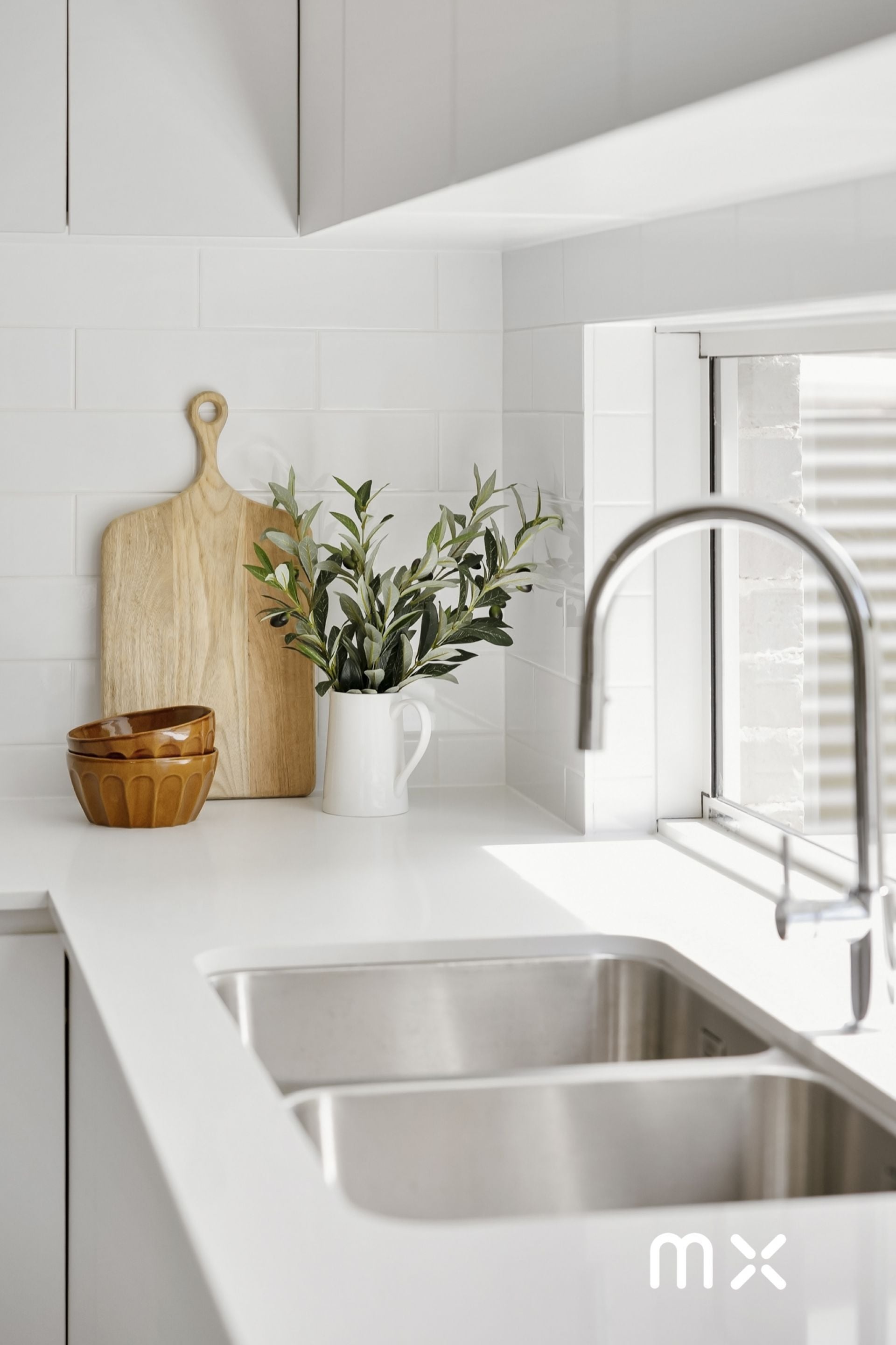 > seamless matte white joinery with matching stainless steel Franke basins, mixer taps and freestanding LG dishwasher