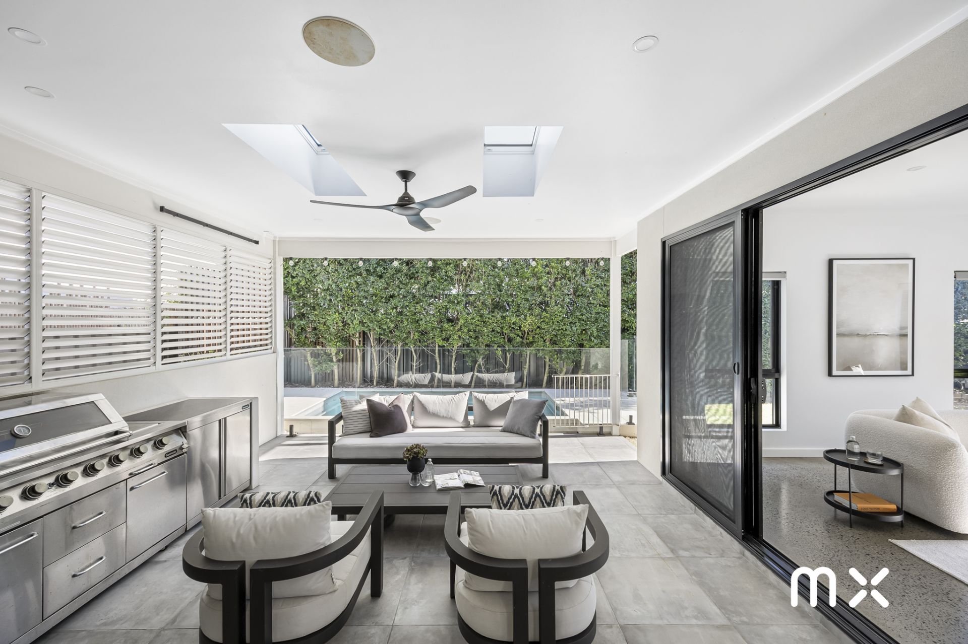 > covered alfresco area with built-in BBQ