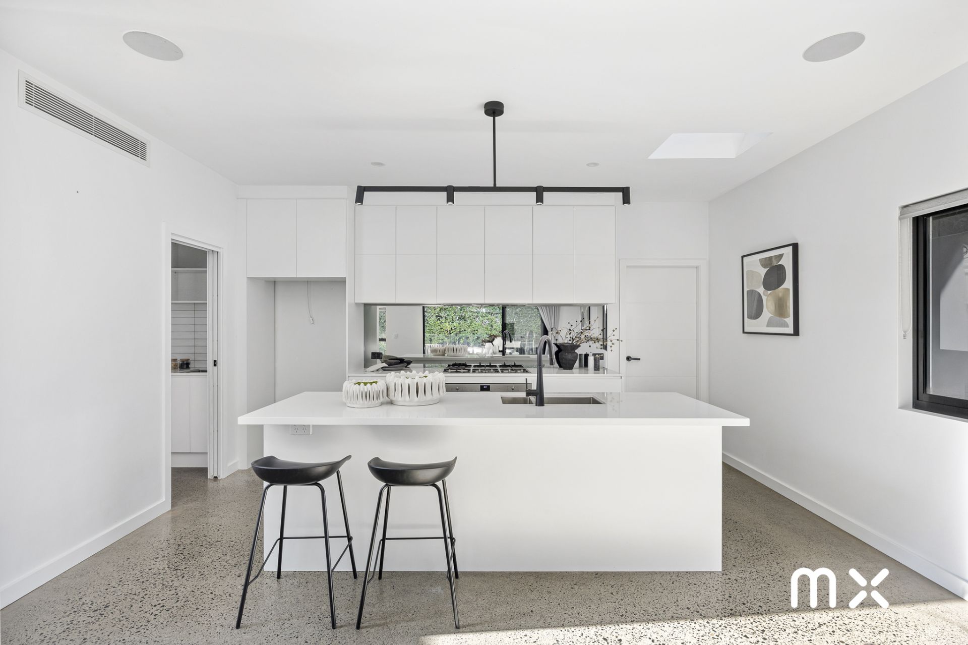 > sleek modern kitchen with walk-in butler’s pantry