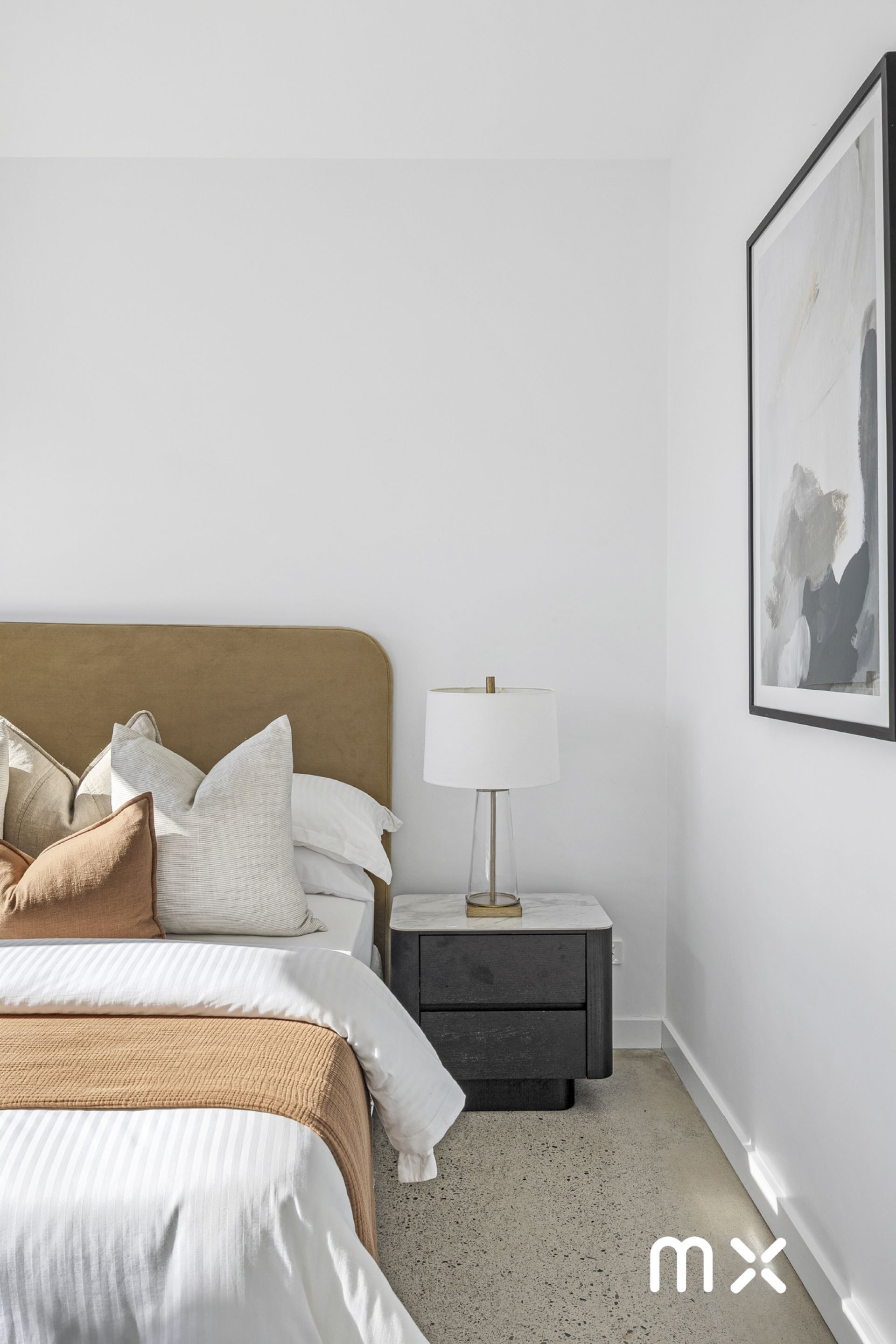 > polished concrete floors and carpeted bedrooms