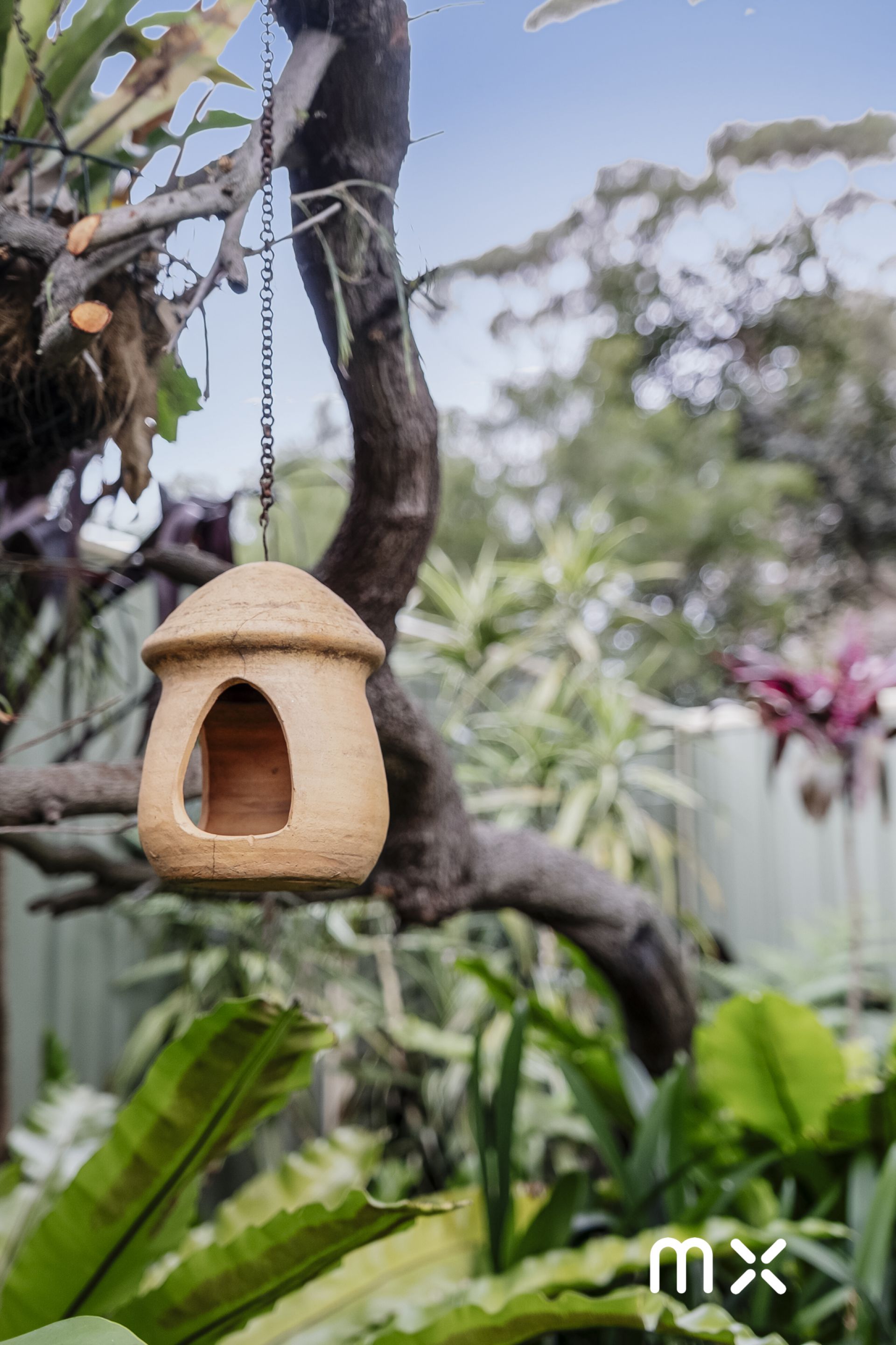 > generous undercover entertaining and enclosed yard surrounded by established gardens