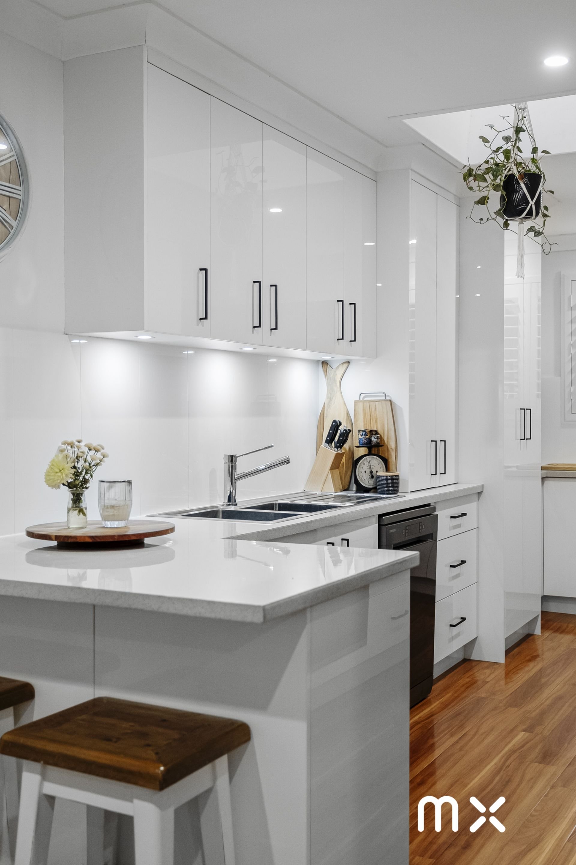 > gas kitchen with ample pantry space and adjoining internal laundry