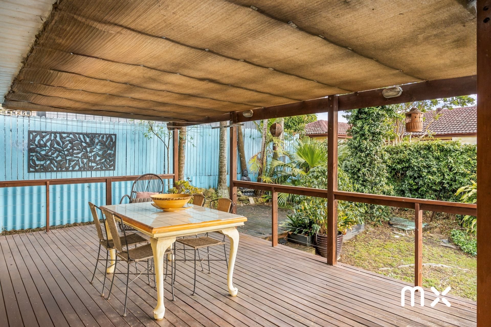 > undercover rear deck with adjacent relaxation space surrounded by established gardens