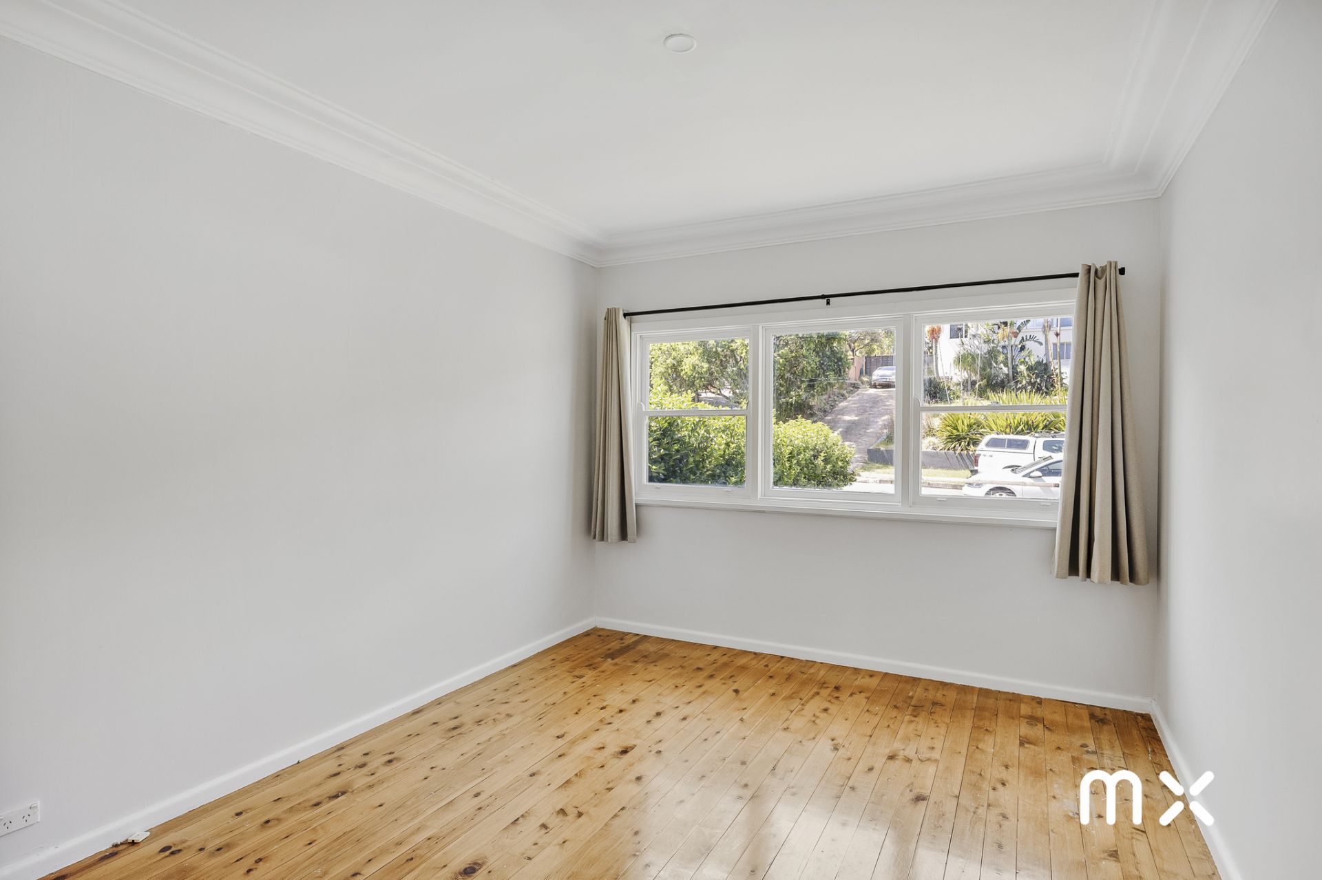 > three well-proportioned bedrooms, all featuring polished hardwood flooring