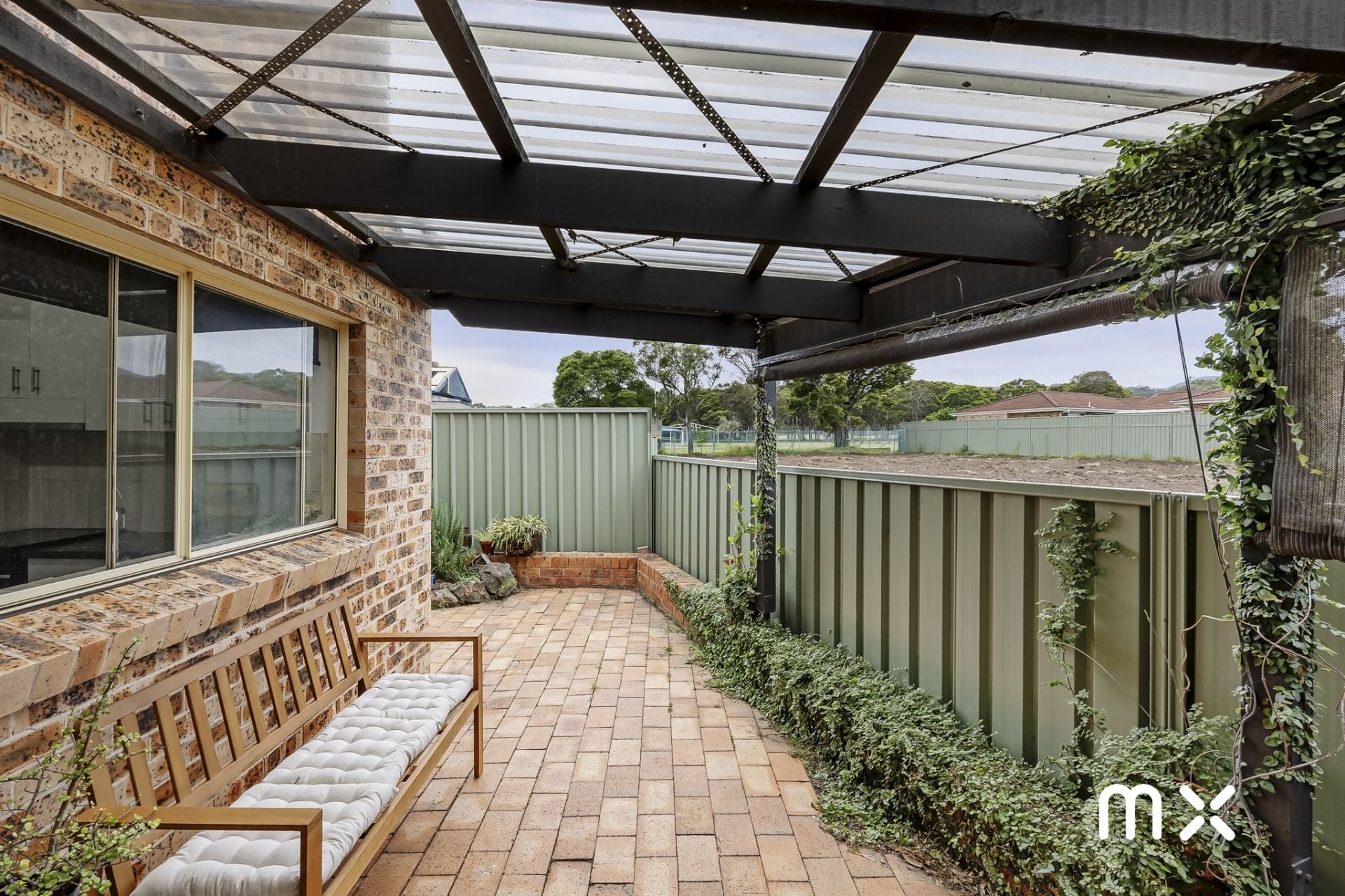 > covered pergola with low maintenance landscaped gardens