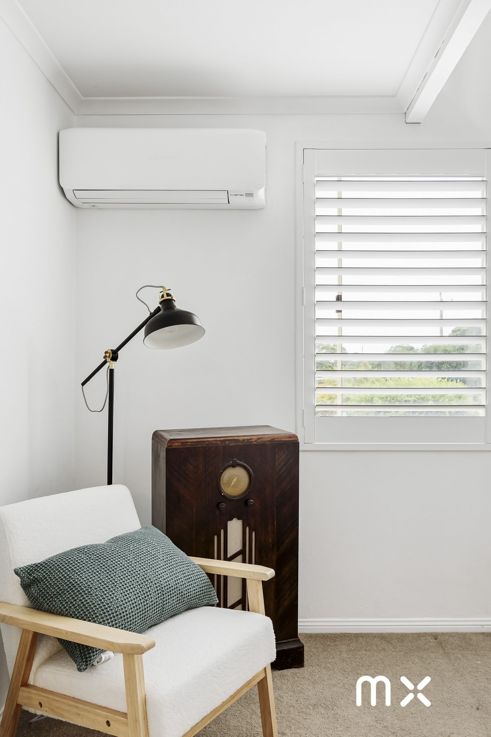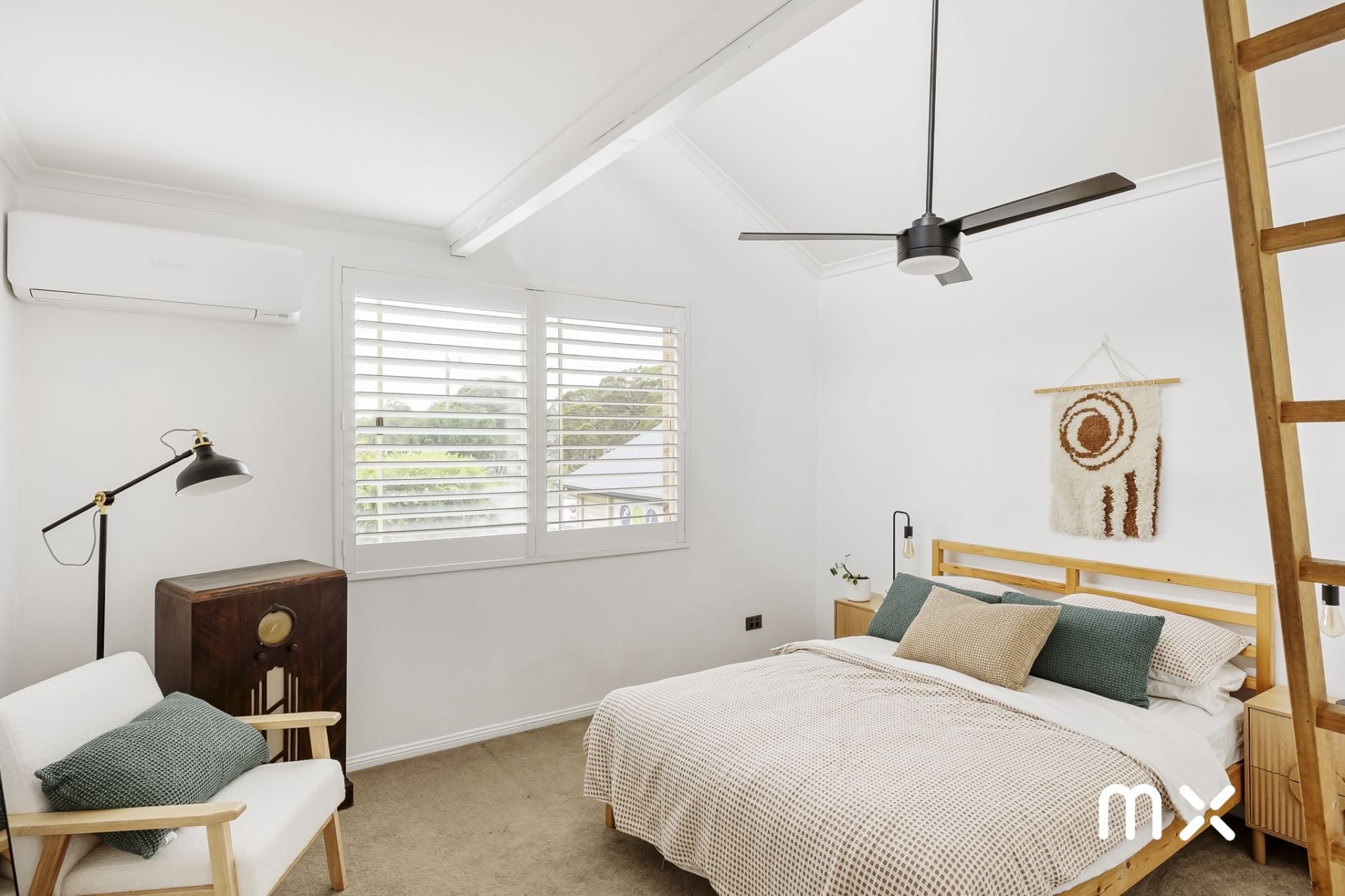 > air conditioning throughout, with ceiling fans and plantation shutters in bedrooms